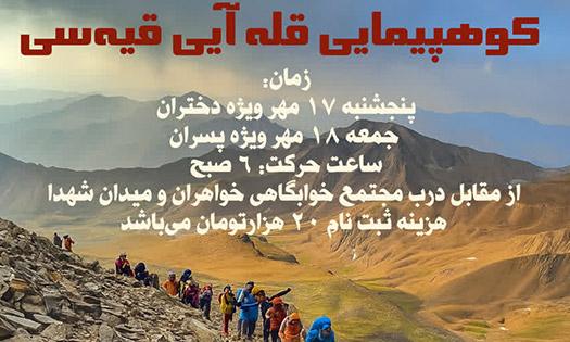 کوهپیمائی به سمت قله آیی قیهسی(قلعه خرس)که علاقه مندان می توانند برای ثبت نام به رابطین این مهم مراجعه نمایند.